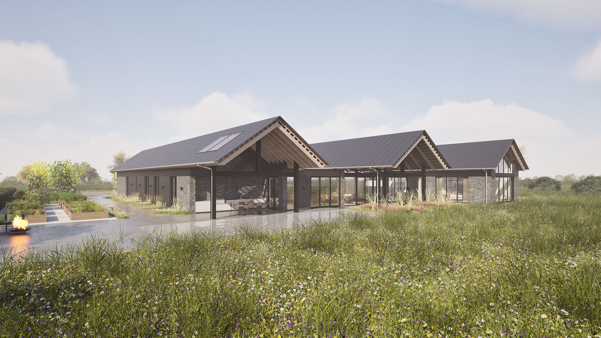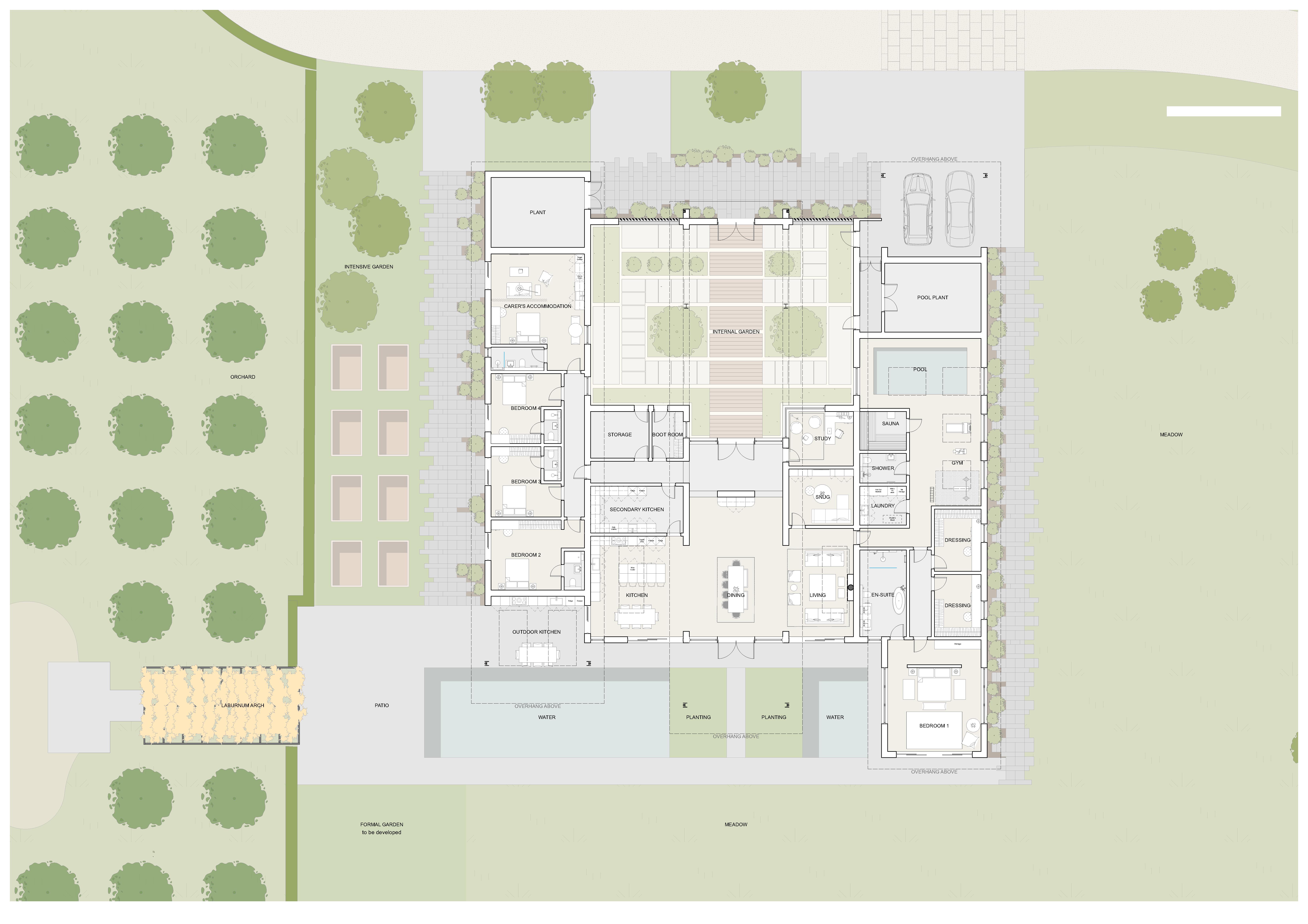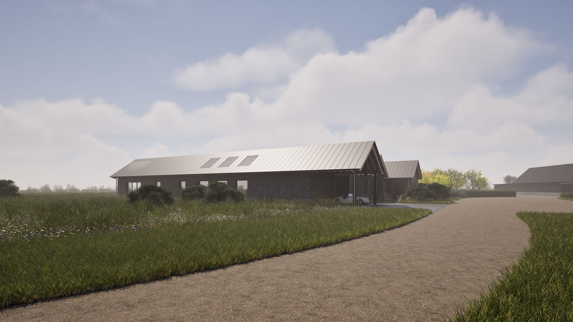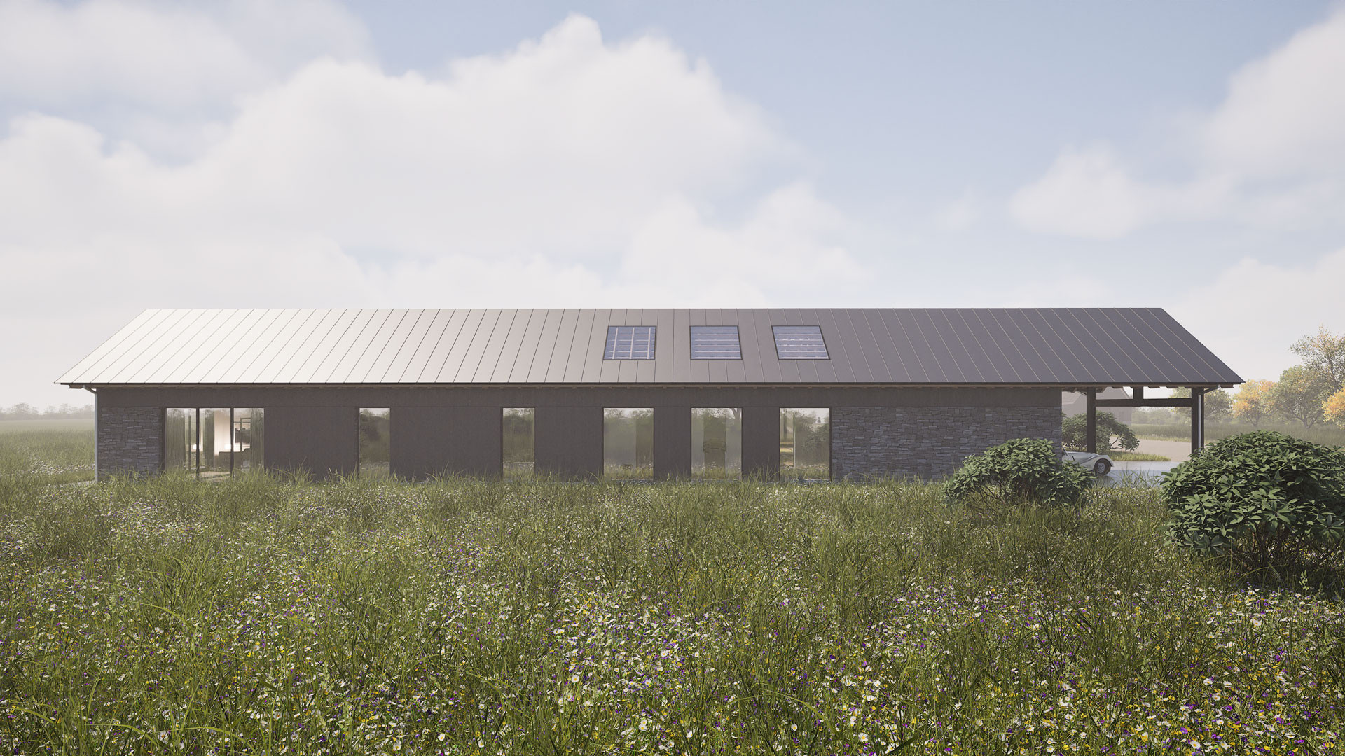 Located in designated open countryside, the project replaces an existing horticultural nursery with a private residential property. Designed with a focus on single-storey, accessible living, the house is divided into three distinct barn-style sections: the main wing comprising a rehabilitation area and primary suite, the central barn for living and socialising, and the residential wing for ancillary bedrooms.