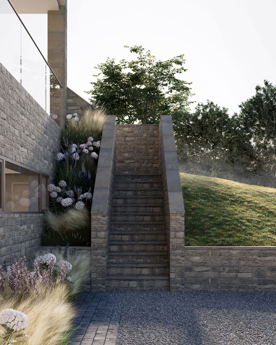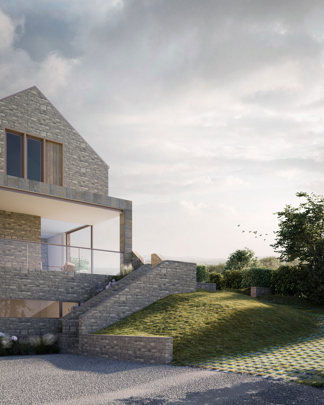 The building form is split between two distinct 'wings' separated by a grand staircase. An open plan family space utilises key views across the site, whilst a snug, office and laundry room hugs the boundary adjacent to the neighbouring property.