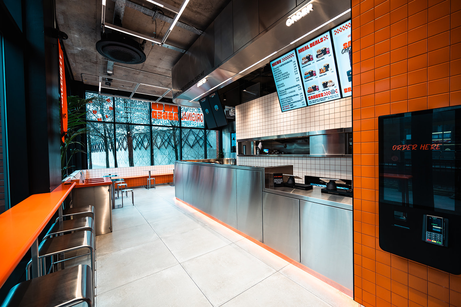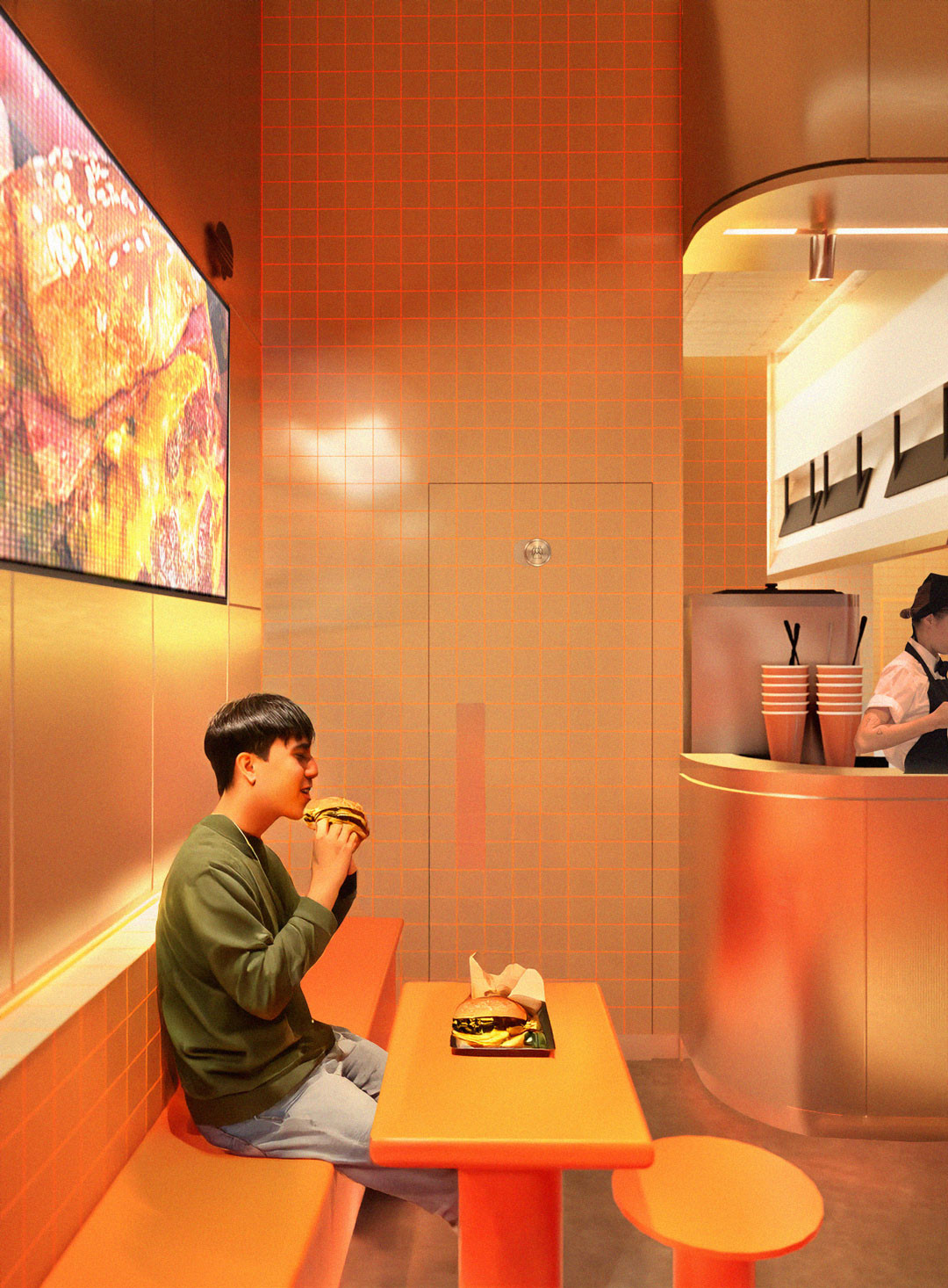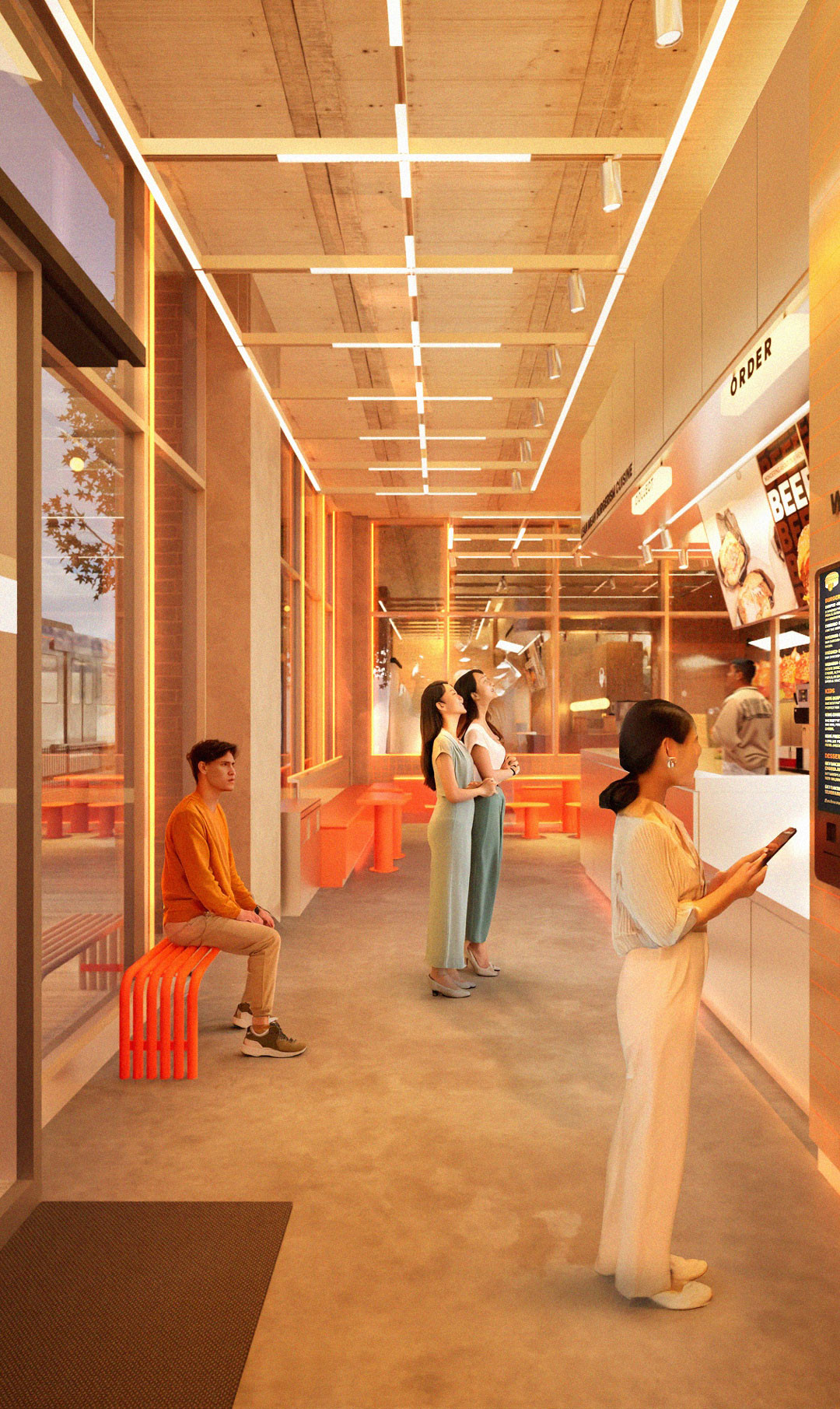 The layout establishes a clear division between public and private areas, ensuring both functionality and flow. Upon entry, the self-service kiosk and POS counter immediately guide customers through the ordering process, leading naturally to the seating area at the rear of the unit for a relaxed dine in experience.
