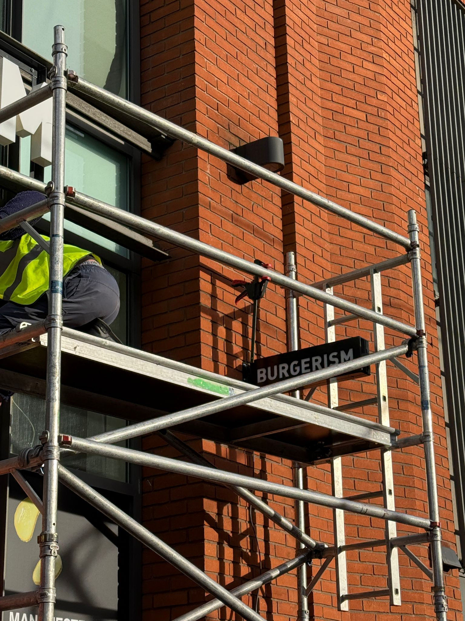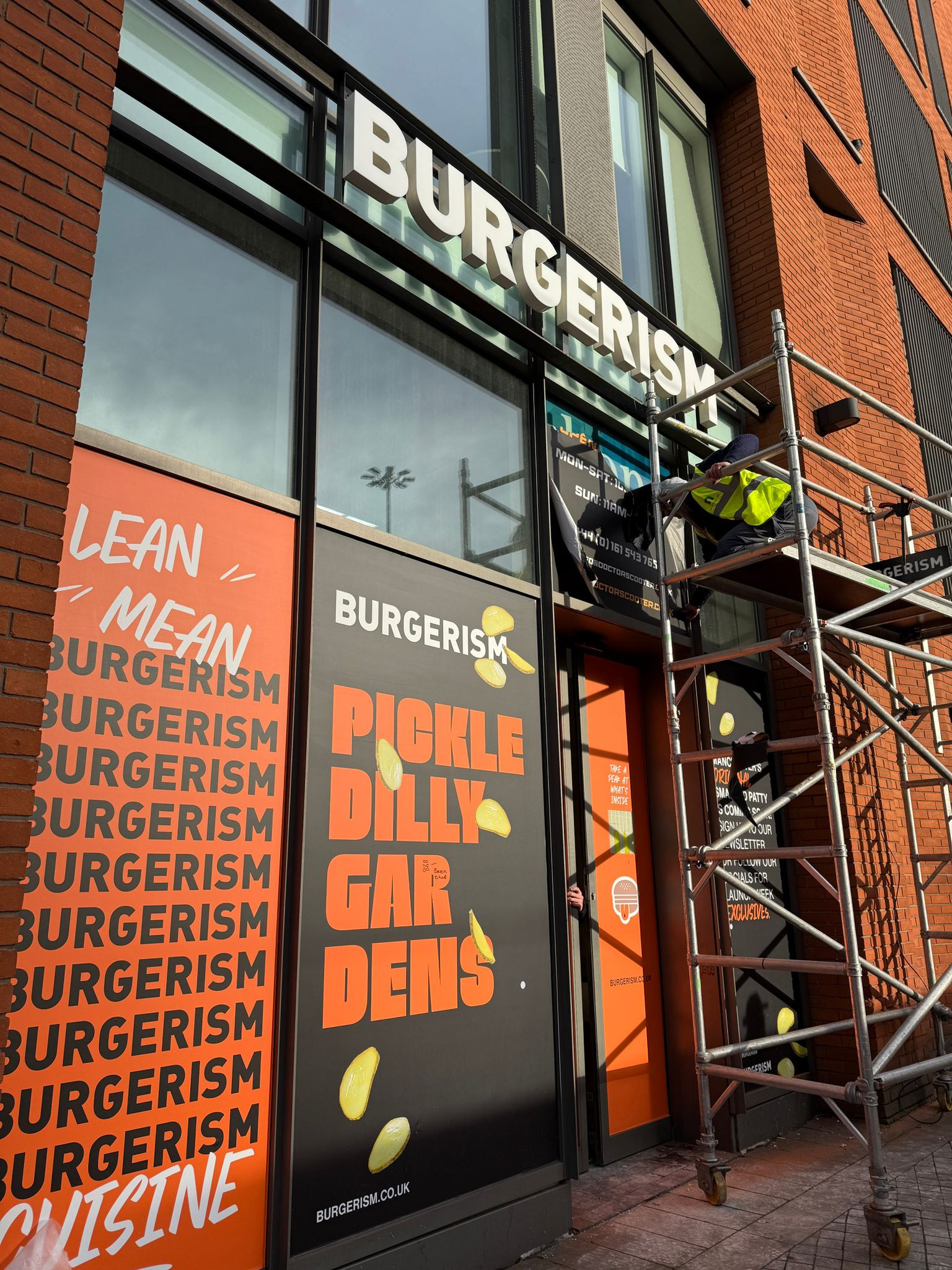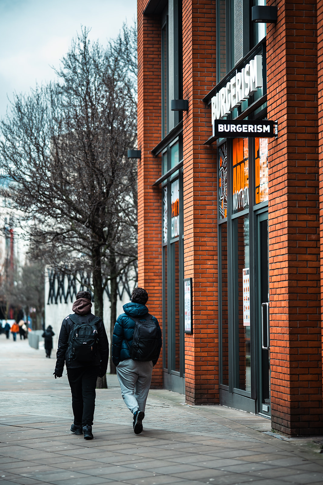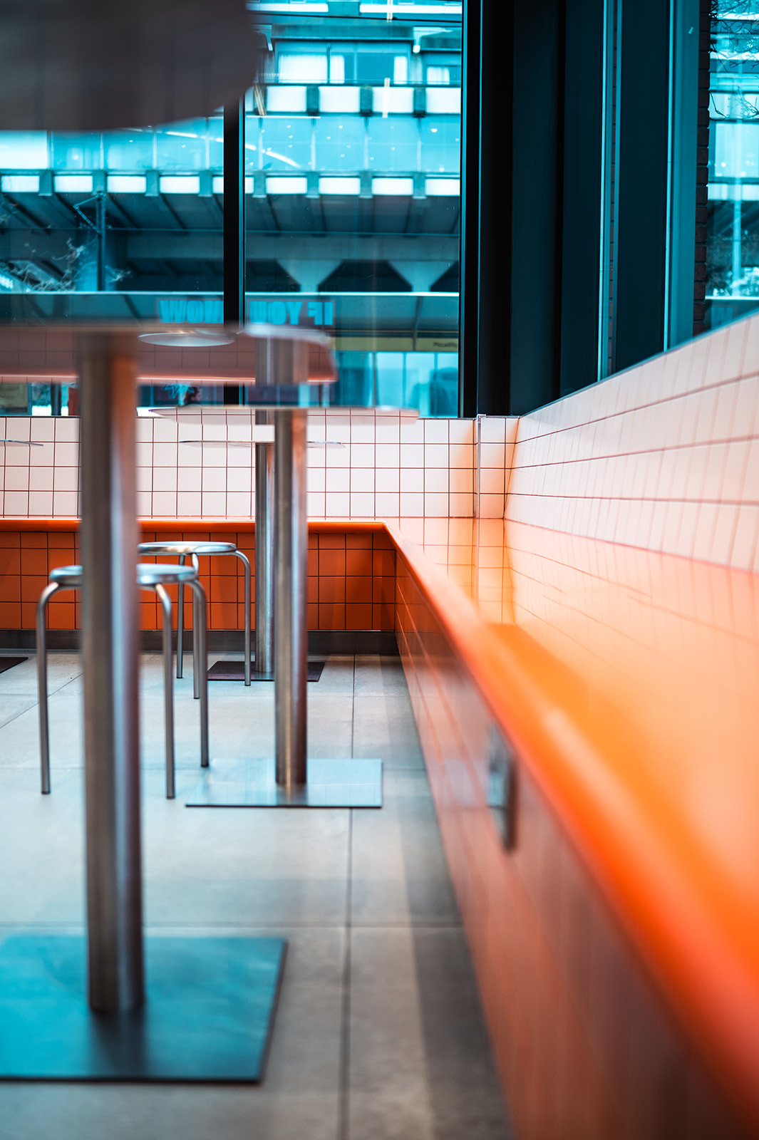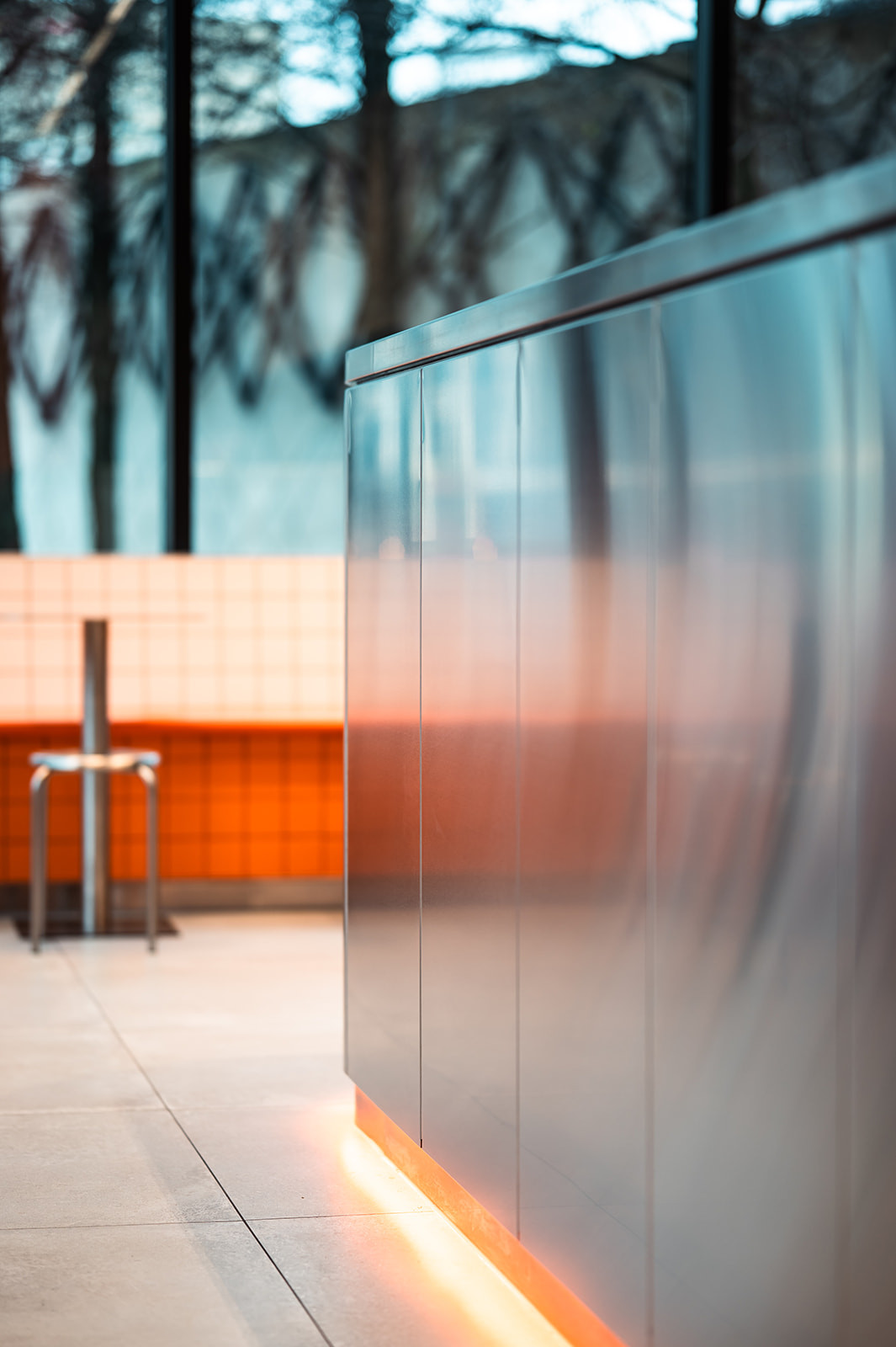 The seating area offers views of Piccadilly Gardens, with seasonal foliage softening the boundary between interior and exterior, enhancing the connection to the surrounding environment. An asymmetrical, U-shaped counter with a gentle curve subtly directs foot traffic, creating a smooth transition from ordering to seating while contributing to the overall spatial rhythm.